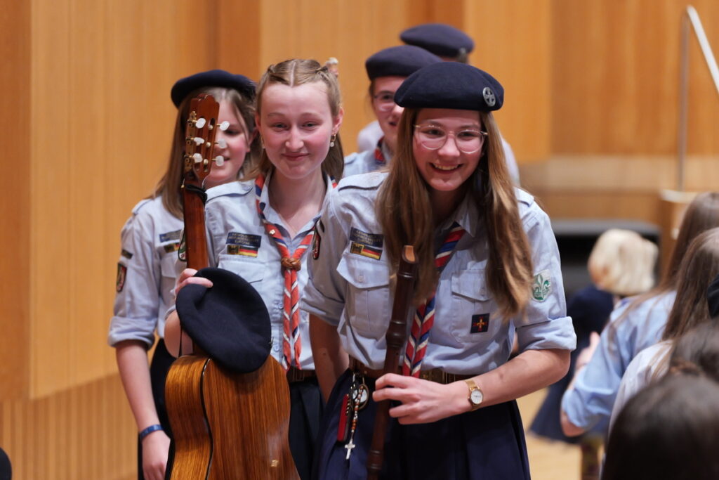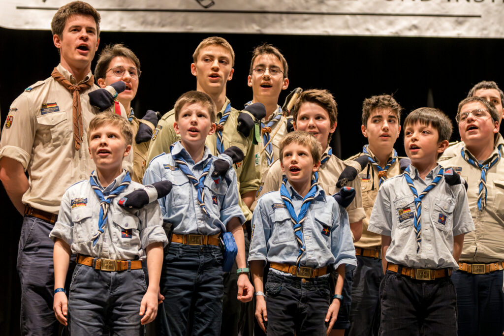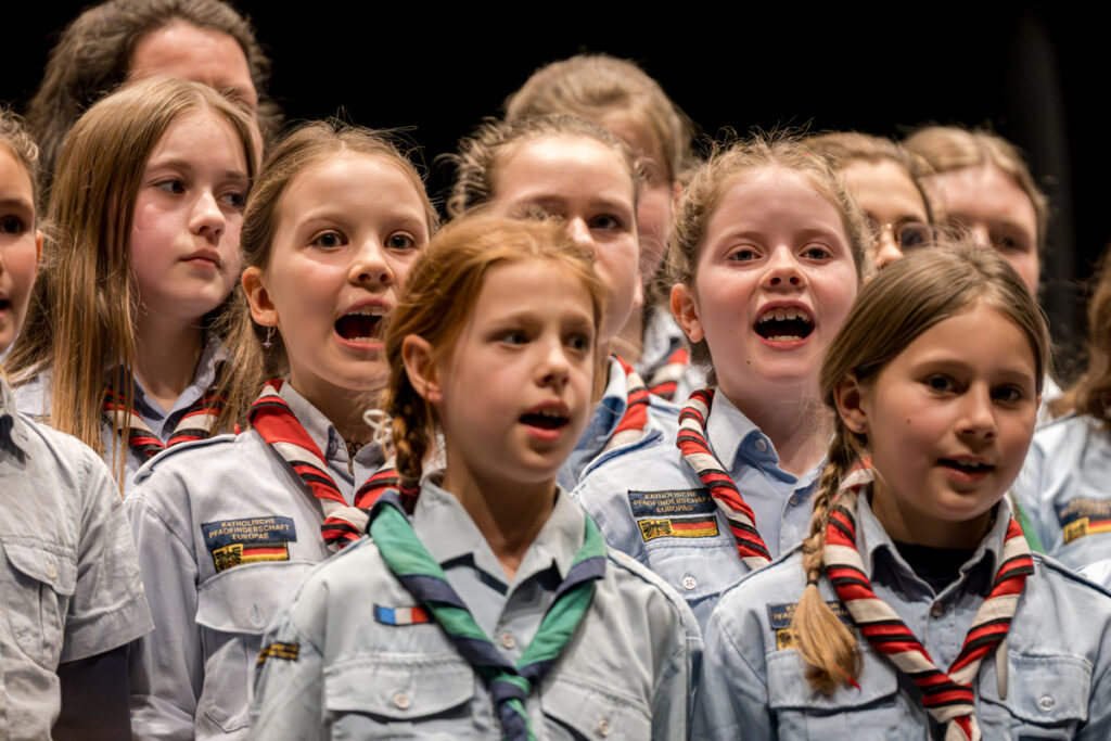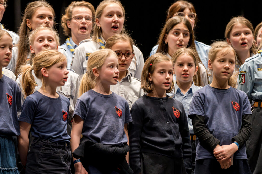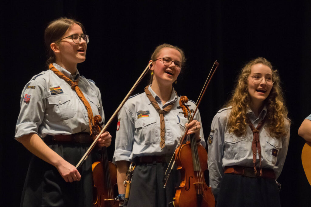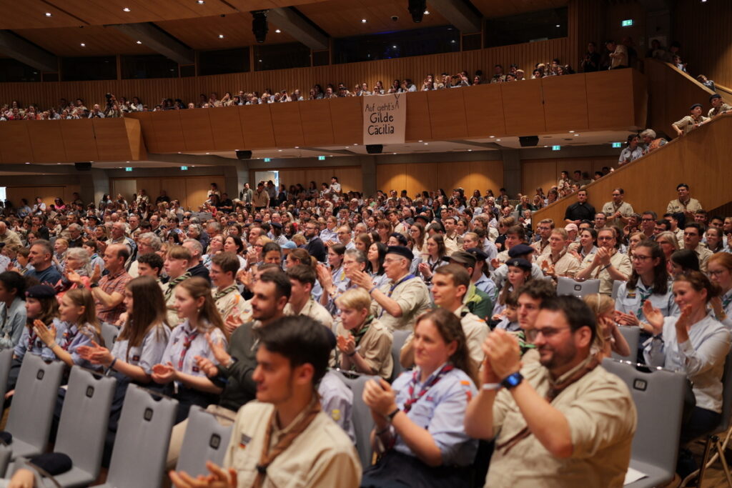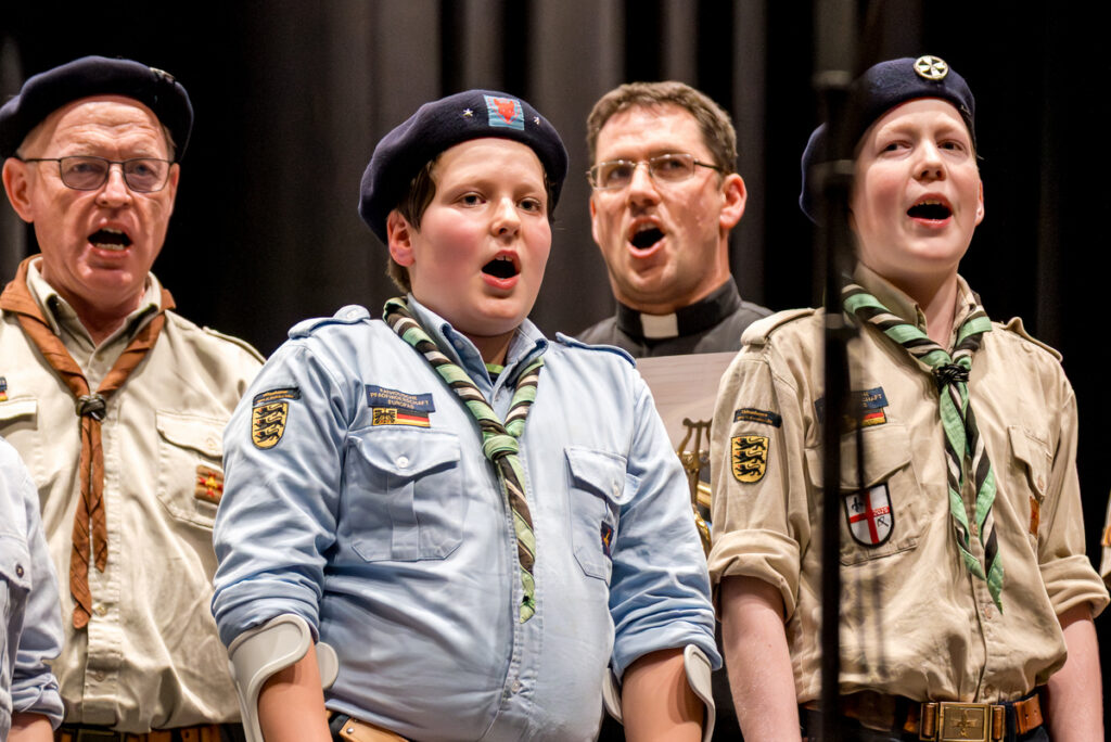 Um nicht ganz aus dem Zeitplan zu geraten, öffnete das Edwin-Scharff-Haus heuer schon um die Mittagszeit seine Pforten. Pünktlich um 15h00 erklang von einem bunt gemixten KPE-Gesamtchor & Orchester der erste Takt von „Herrscher des Himmels“ von J.S. Bach. Nach den Eröffnungsworten von Nina und Maria, Bundesmeisterin und Bundessekretariat, ergriff Günther W. das Wort, der die KPE vor 50 Jahren (mit)gegründet hatte und trotz seiner über 90 Jahre gekommen war. Standing ovations waren die Reaktion des Publikums! In den folgenden Stunden boten die musizierenden Gruppen ein überaus abwechslungsreiches Programm. Dazwischen gab es originelle Jubiläumseinlagen, von einem Rückblicksfilm mit Aufnahmen aus den ersten Jahren, über ein selbstgemachtes Jubiläumslied der Bundes- und Landesführungen, bis hin zu einem 50-Jahre-KPE-Musical. In der Pause konnte man an verschiedenen Ständen in die Geschichte der KPE eintauchen und in uralten Ausgaben der „Pfadfinder Mariens“ aus den frühen 1980er blättern. Unsere Runde St. Benedikt, das Logistik-Team der KPE, versorgte währenddessen alle Sänger und Gäste mit Semmeln und Leberkäs, und einem 1000-Krapfen-Jubiläumsberg. An dieser Stelle ist von der einzigen Niederlage des Abends zu berichten: Der Berg wurde trotz vereinter Anstrengung aller Wölflinge nicht bezwungen!
