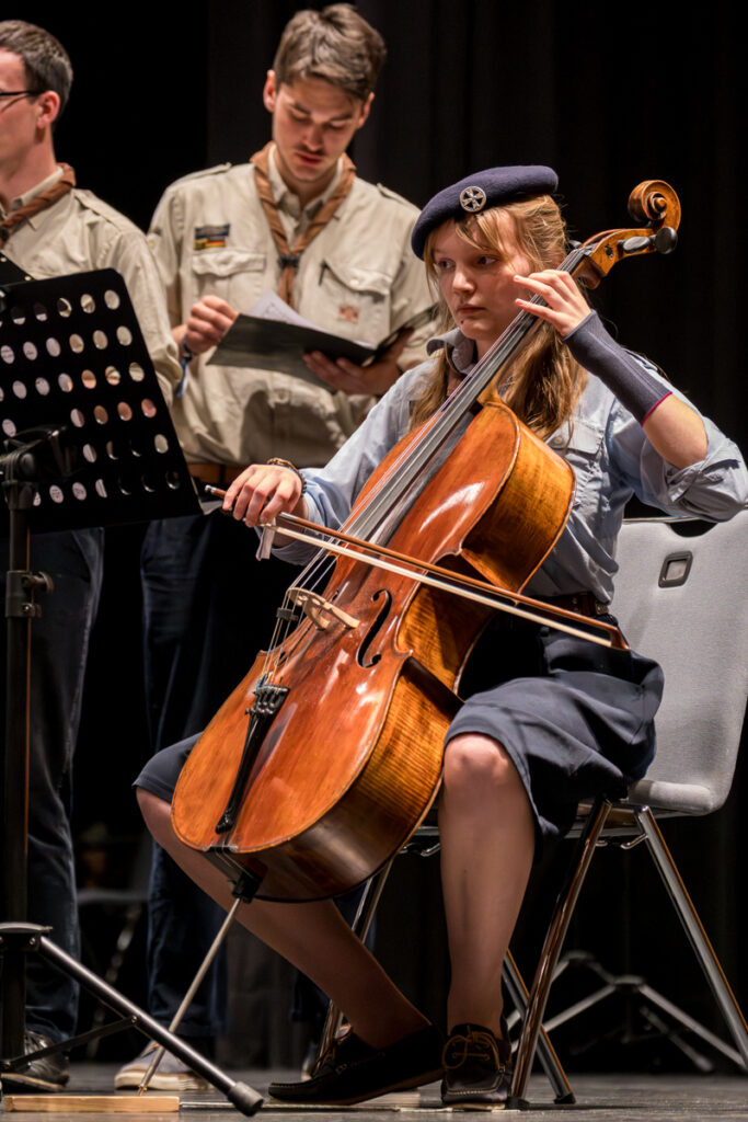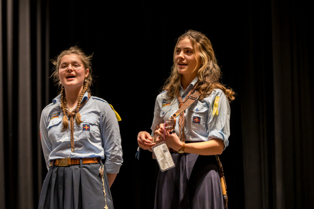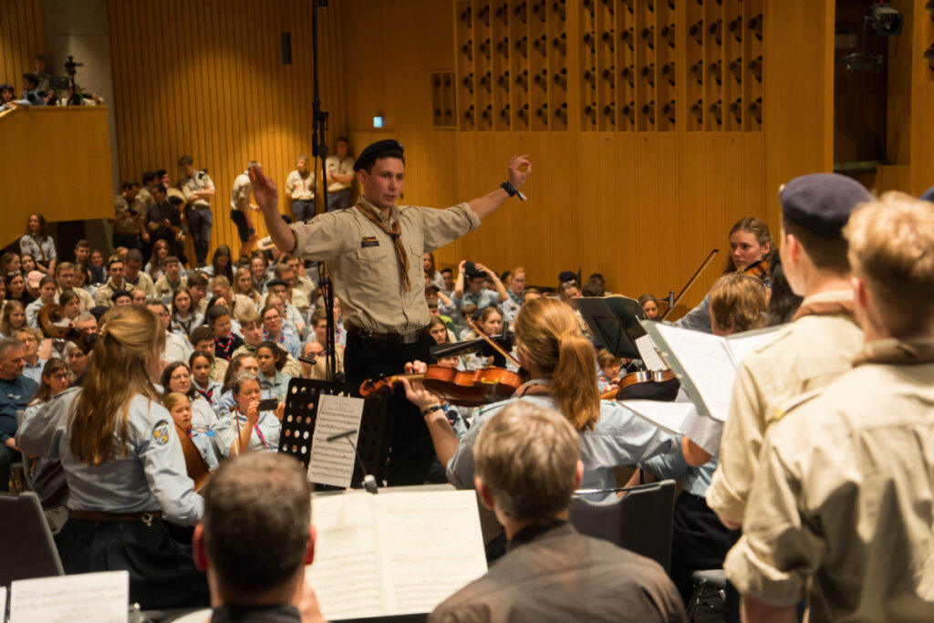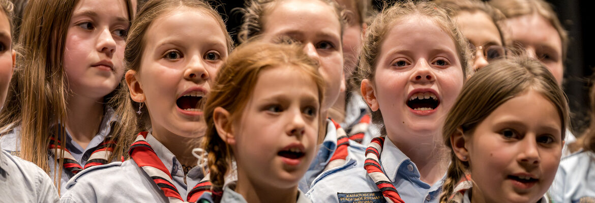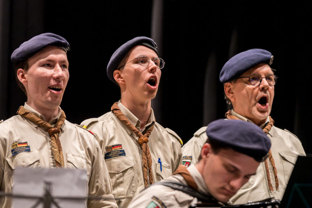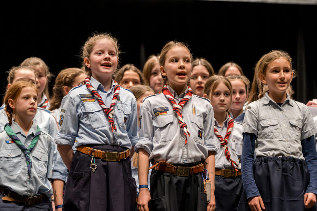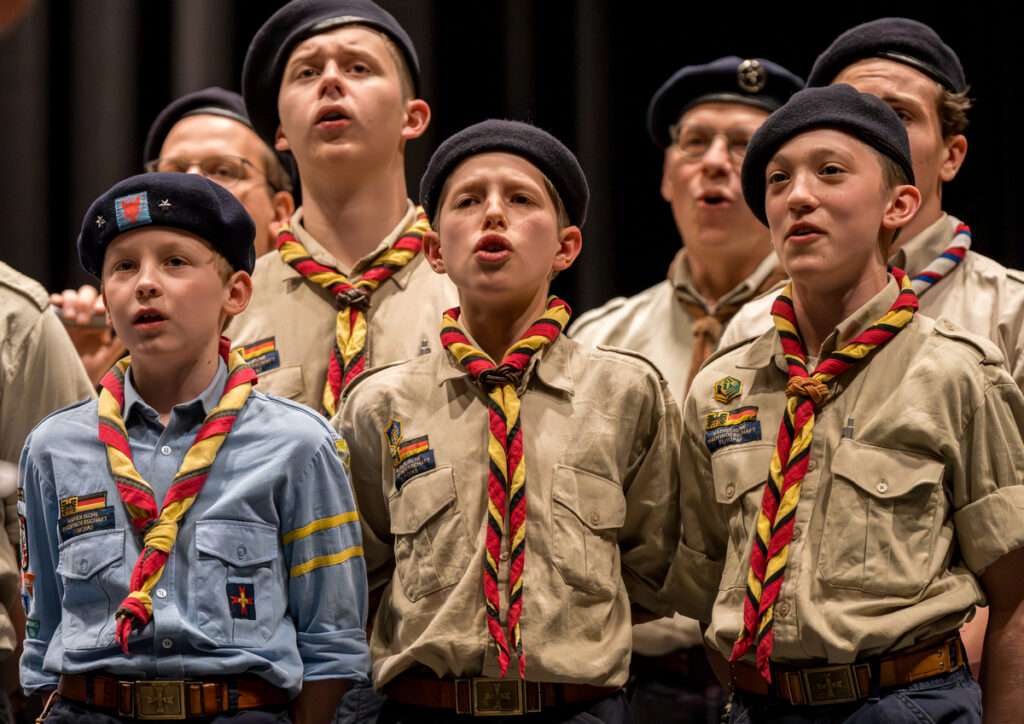 Um nicht ganz aus dem Zeitplan zu geraten, öffnete das Edwin-Scharff-Haus heuer schon um die Mittagszeit seine Pforten. Pünktlich um 15h00 erklang von einem bunt gemixten KPE-Gesamtchor & Orchester der erste Takt von „Herrscher des Himmels“ von J.S. Bach. Nach den Eröffnungsworten von Nina und Maria, Bundesmeisterin und Bundessekretariat, ergriff Günther W. das Wort, der die KPE vor 50 Jahren (mit)gegründet hatte und trotz seiner über 90 Jahre gekommen war. Standing ovations waren die Reaktion des Publikums! In den folgenden Stunden boten die musizierenden Gruppen ein überaus abwechslungsreiches Programm. Dazwischen gab es originelle Jubiläumseinlagen, von einem Rückblicksfilm mit Aufnahmen aus den ersten Jahren, über ein selbstgemachtes Jubiläumslied der Bundes- und Landesführungen, bis hin zu einem 50-Jahre-KPE-Musical. In der Pause konnte man an verschiedenen Ständen in die Geschichte der KPE eintauchen und in uralten Ausgaben der „Pfadfinder Mariens“ aus den frühen 1980er blättern. Unsere Runde St. Benedikt, das Logistik-Team der KPE, versorgte währenddessen alle Sänger und Gäste mit Semmeln und Leberkäs, und einem 1000-Krapfen-Jubiläumsberg. An dieser Stelle ist von der einzigen Niederlage des Abends zu berichten: Der Berg wurde trotz vereinter Anstrengung aller Wölflinge nicht bezwungen!