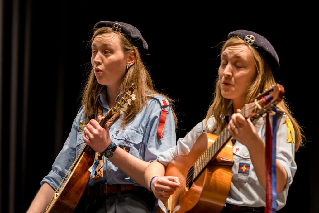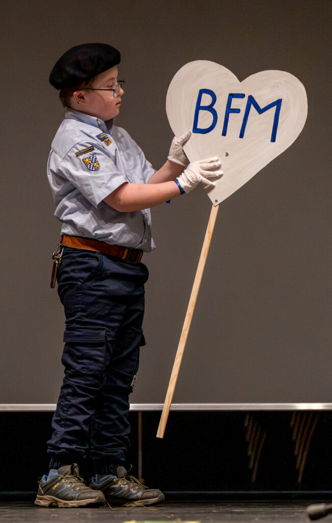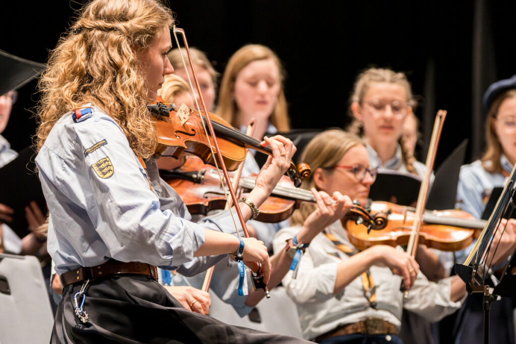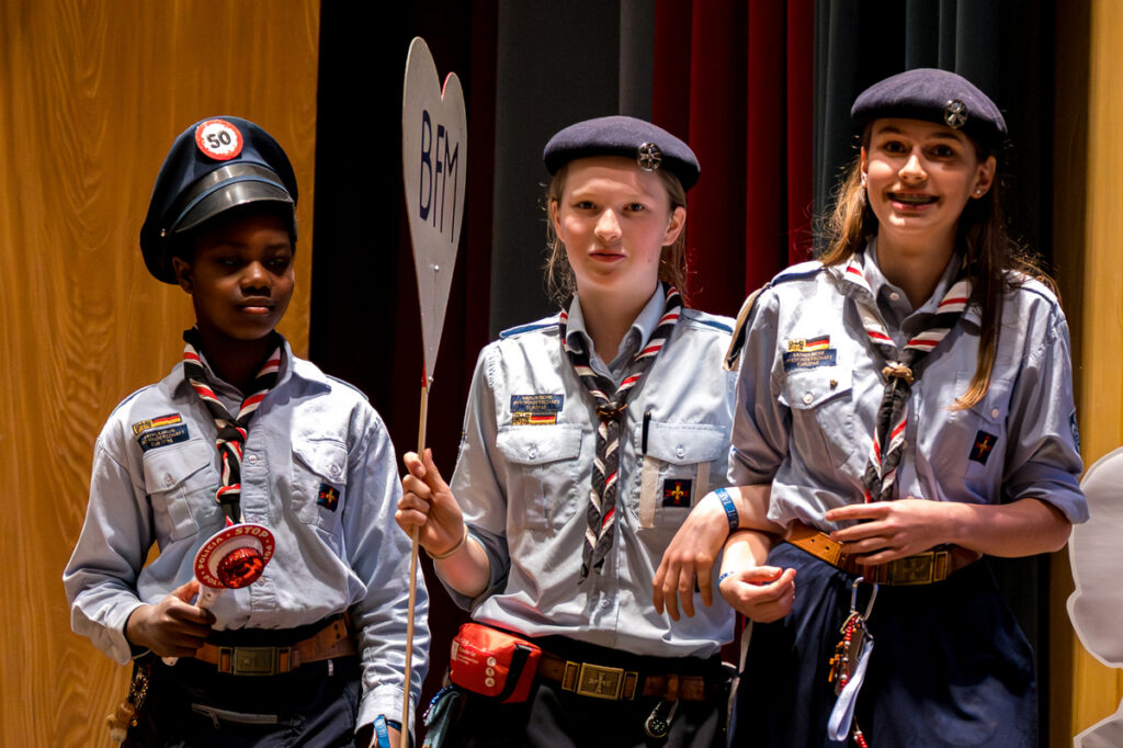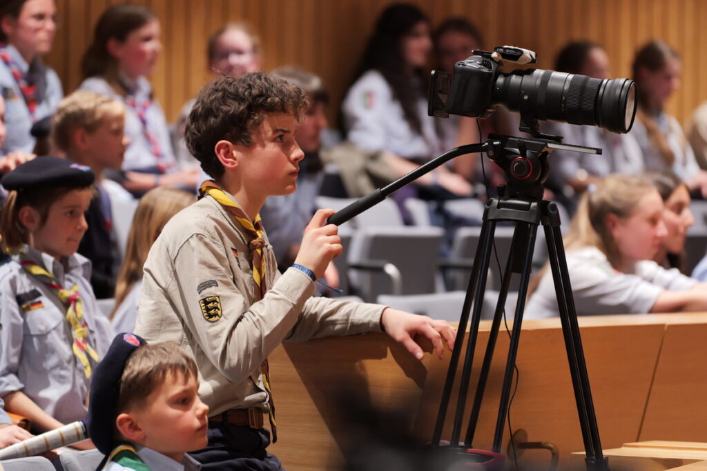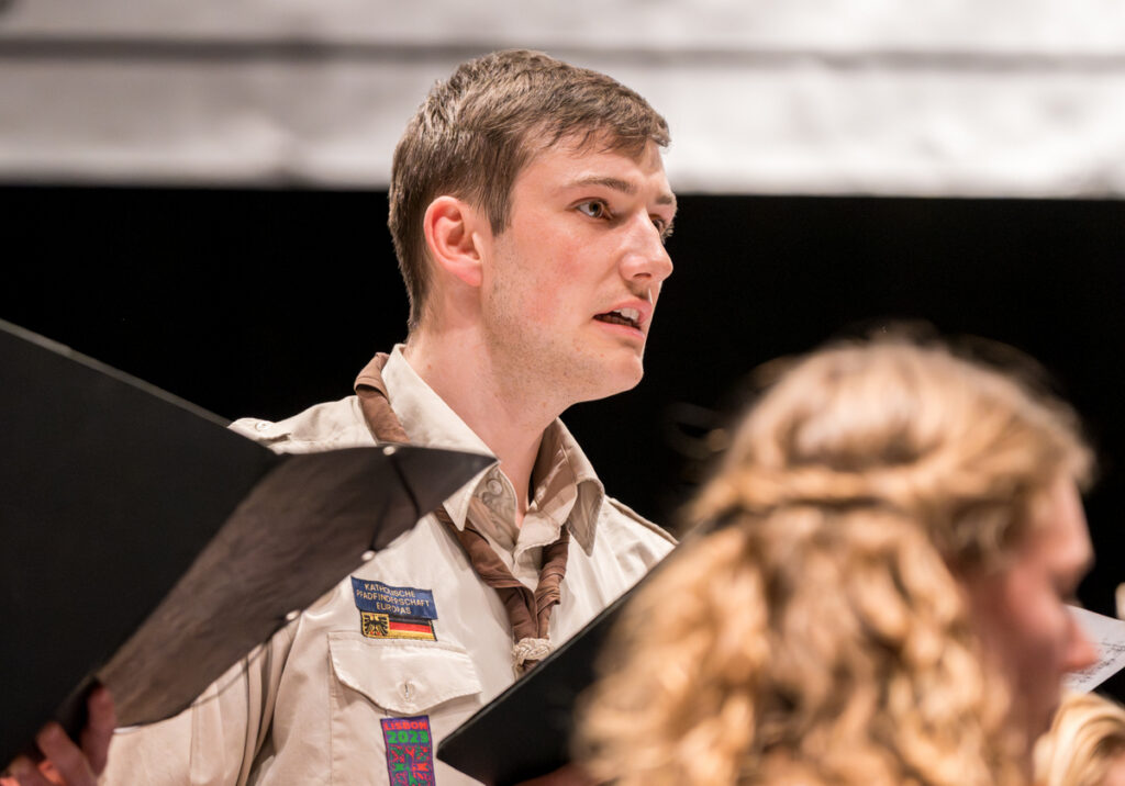 Um nicht ganz aus dem Zeitplan zu geraten, öffnete das Edwin-Scharff-Haus heuer schon um die Mittagszeit seine Pforten. Pünktlich um 15h00 erklang von einem bunt gemixten KPE-Gesamtchor & Orchester der erste Takt von „Herrscher des Himmels“ von J.S. Bach. Nach den Eröffnungsworten von Nina und Maria, Bundesmeisterin und Bundessekretariat, ergriff Günther W. das Wort, der die KPE vor 50 Jahren (mit)gegründet hatte und trotz seiner über 90 Jahre gekommen war. Standing ovations waren die Reaktion des Publikums! In den folgenden Stunden boten die musizierenden Gruppen ein überaus abwechslungsreiches Programm. Dazwischen gab es originelle Jubiläumseinlagen, von einem Rückblicksfilm mit Aufnahmen aus den ersten Jahren, über ein selbstgemachtes Jubiläumslied der Bundes- und Landesführungen, bis hin zu einem 50-Jahre-KPE-Musical. In der Pause konnte man an verschiedenen Ständen in die Geschichte der KPE eintauchen und in uralten Ausgaben der „Pfadfinder Mariens“ aus den frühen 1980er blättern. Unsere Runde St. Benedikt, das Logistik-Team der KPE, versorgte währenddessen alle Sänger und Gäste mit Semmeln und Leberkäs, und einem 1000-Krapfen-Jubiläumsberg. An dieser Stelle ist von der einzigen Niederlage des Abends zu berichten: Der Berg wurde trotz vereinter Anstrengung aller Wölflinge nicht bezwungen!