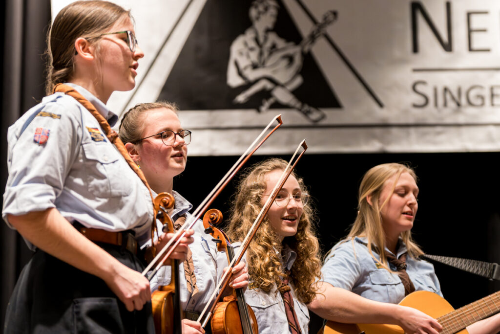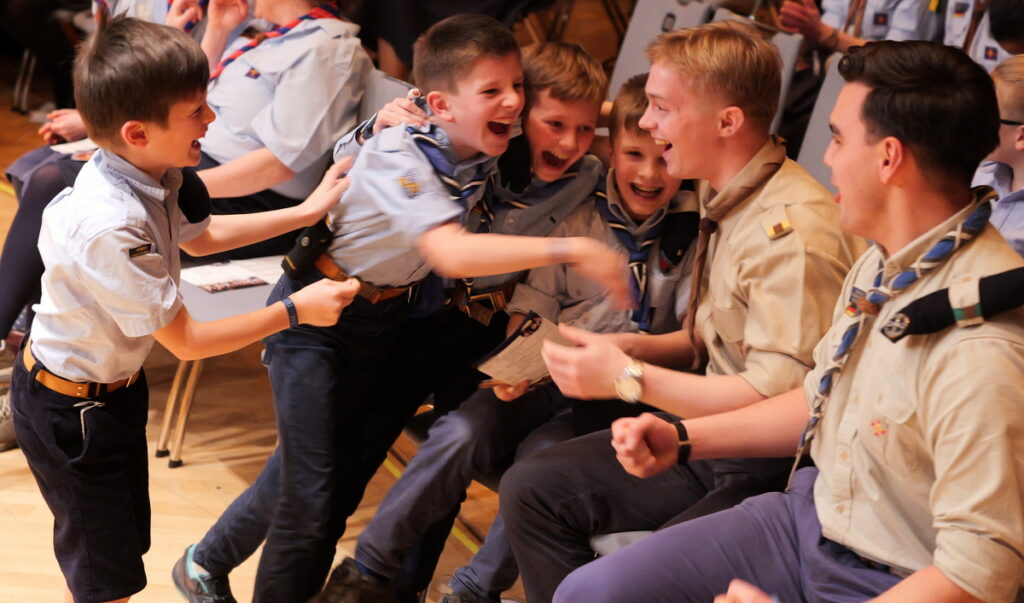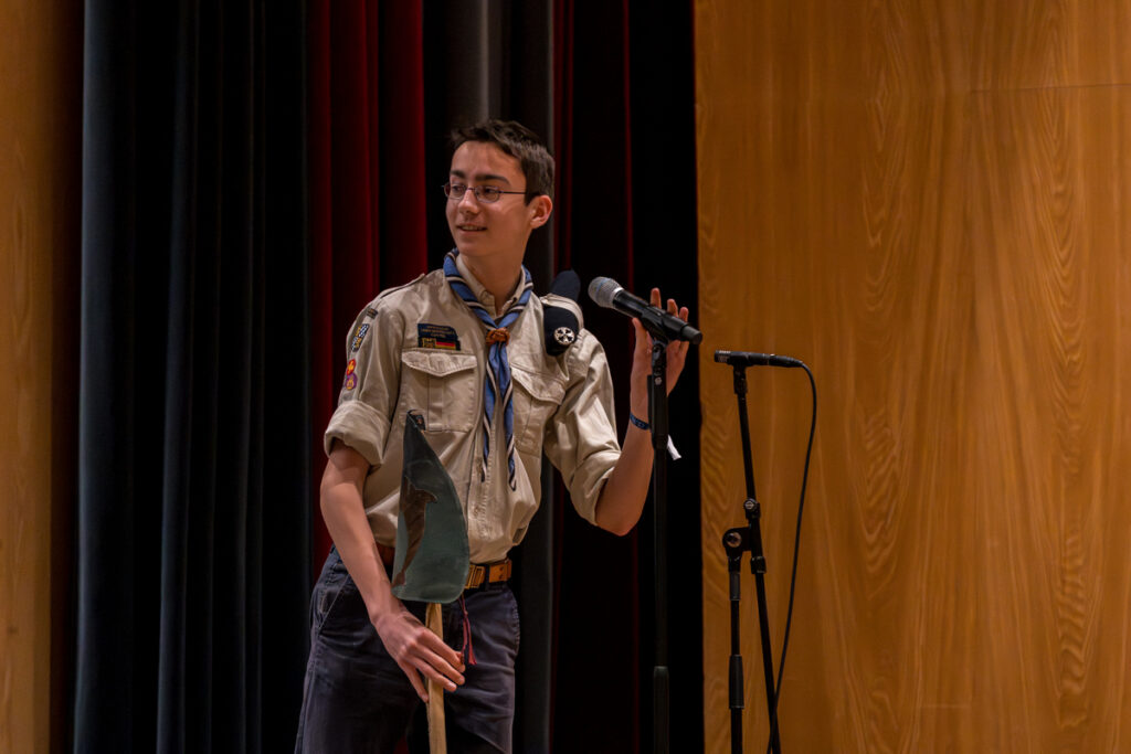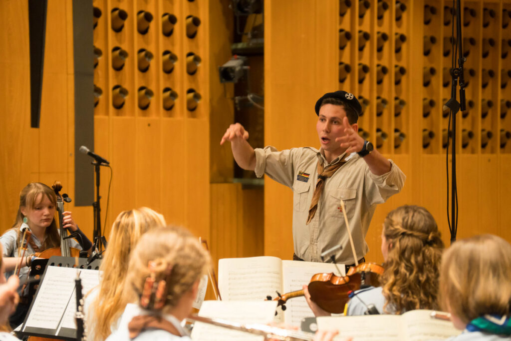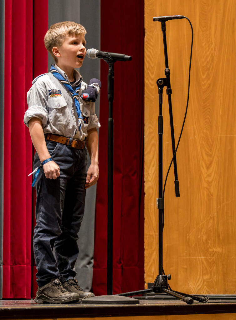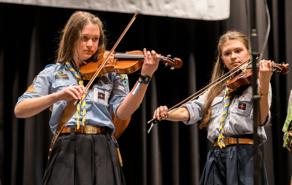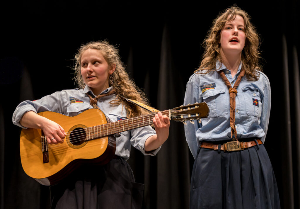 Um nicht ganz aus dem Zeitplan zu geraten, öffnete das Edwin-Scharff-Haus heuer schon um die Mittagszeit seine Pforten. Pünktlich um 15h00 erklang von einem bunt gemixten KPE-Gesamtchor & Orchester der erste Takt von „Herrscher des Himmels“ von J.S. Bach. Nach den Eröffnungsworten von Nina und Maria, Bundesmeisterin und Bundessekretariat, ergriff Günther W. das Wort, der die KPE vor 50 Jahren (mit)gegründet hatte und trotz seiner über 90 Jahre gekommen war. Standing ovations waren die Reaktion des Publikums! In den folgenden Stunden boten die musizierenden Gruppen ein überaus abwechslungsreiches Programm. Dazwischen gab es originelle Jubiläumseinlagen, von einem Rückblicksfilm mit Aufnahmen aus den ersten Jahren, über ein selbstgemachtes Jubiläumslied der Bundes- und Landesführungen, bis hin zu einem 50-Jahre-KPE-Musical. In der Pause konnte man an verschiedenen Ständen in die Geschichte der KPE eintauchen und in uralten Ausgaben der „Pfadfinder Mariens“ aus den frühen 1980er blättern. Unsere Runde St. Benedikt, das Logistik-Team der KPE, versorgte währenddessen alle Sänger und Gäste mit Semmeln und Leberkäs, und einem 1000-Krapfen-Jubiläumsberg. An dieser Stelle ist von der einzigen Niederlage des Abends zu berichten: Der Berg wurde trotz vereinter Anstrengung aller Wölflinge nicht bezwungen!